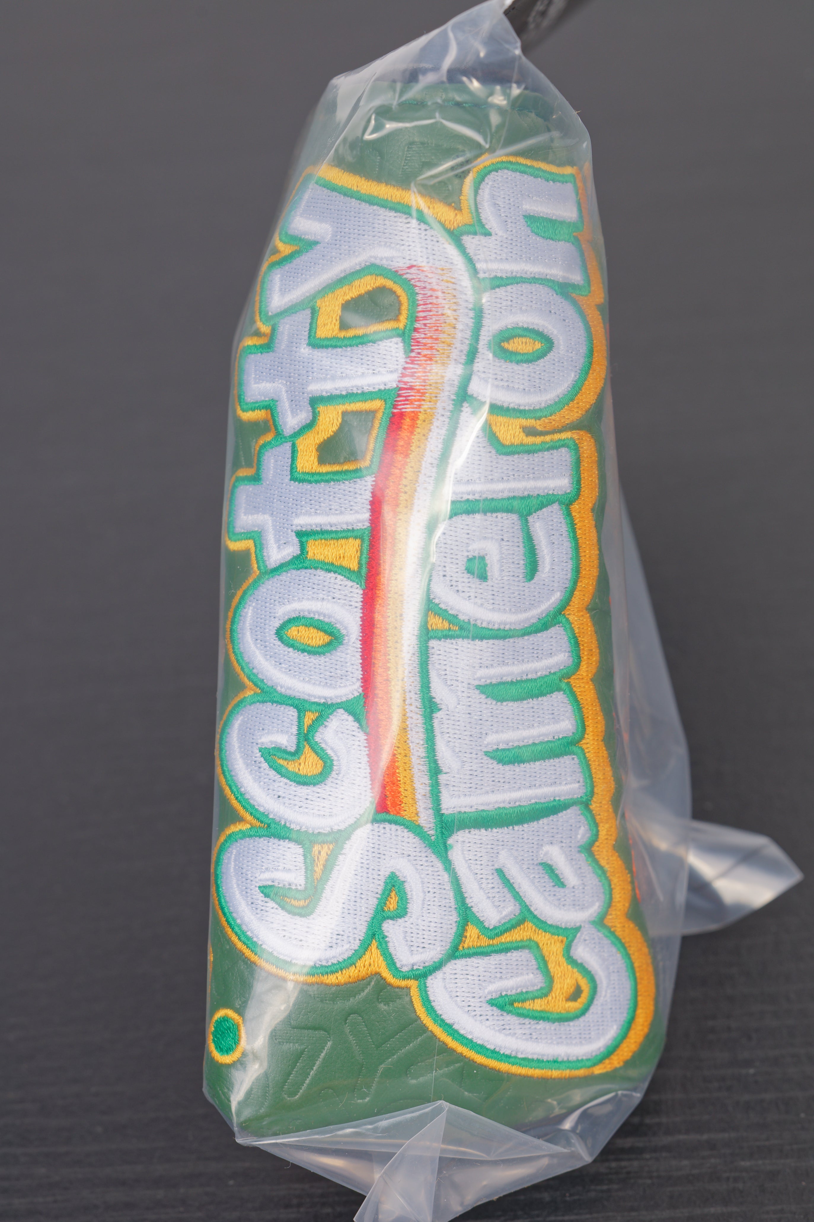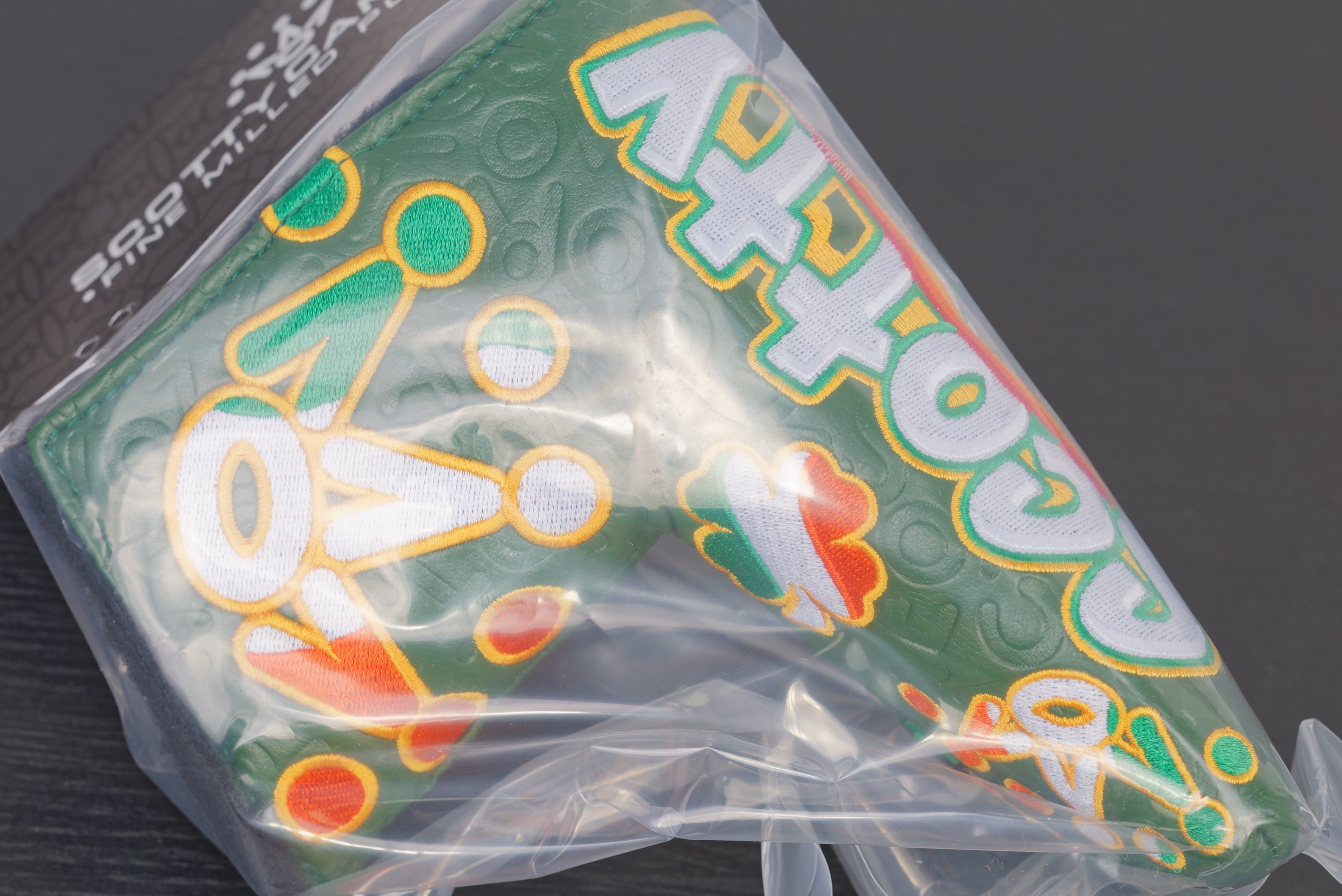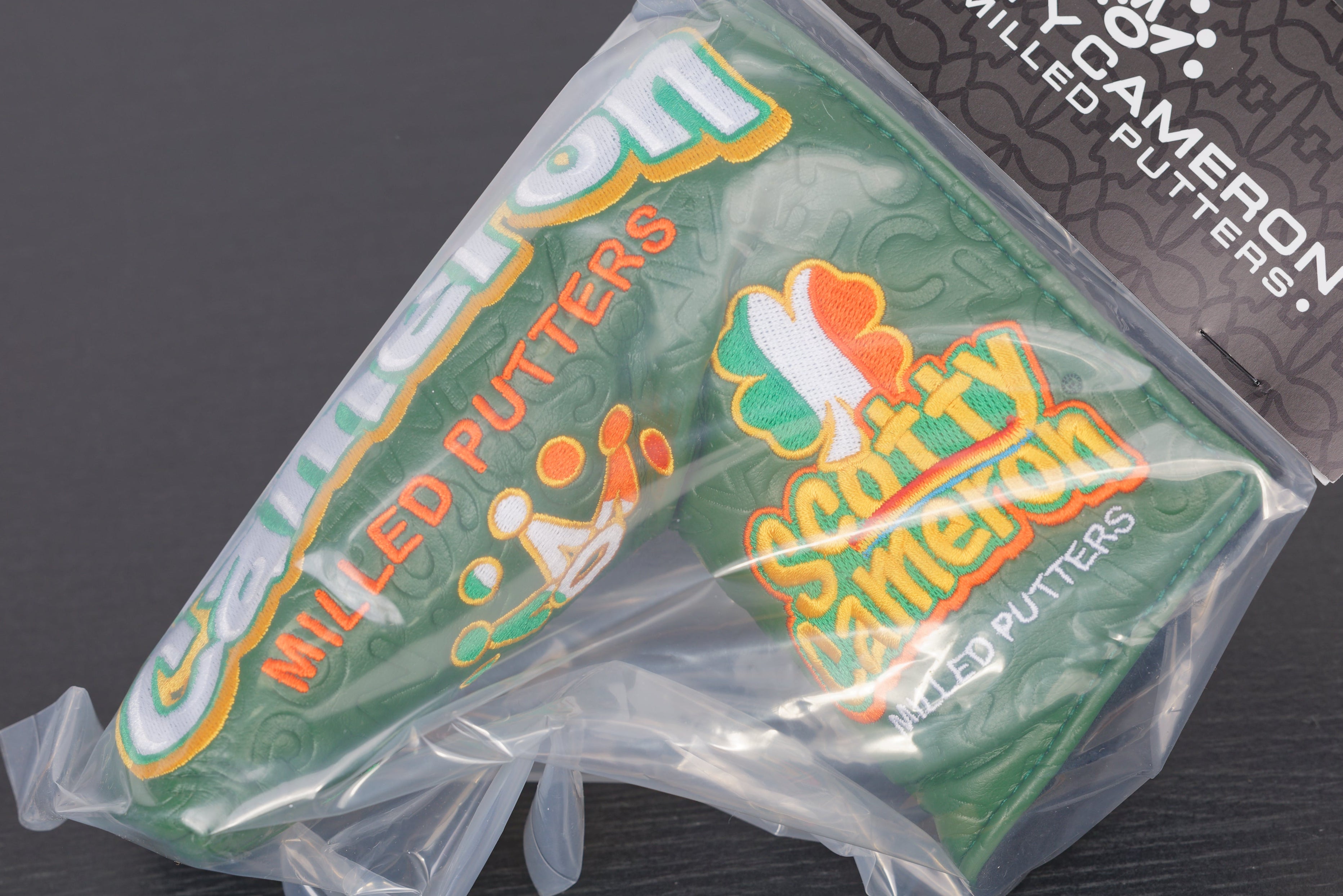 Additional Info.: Superb new SPD headcover, in an embossed green coloured pleather, Irish coloured embroidery making up a 4 leaf clover, 7 Point Crown and a leprechaun! Scotty Cameron on top, with smaller details on the side.